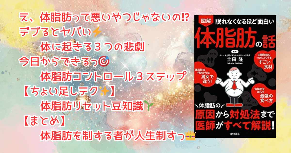 今日の本📚は『眠れなくなるほど面白い 図解 体脂肪の話』(by土田孝さん)をベースに、体脂肪のリアルと、超簡単なダイエット術について語るね💖✨